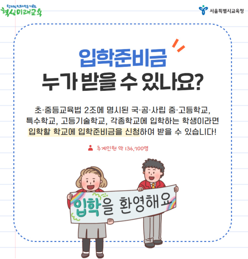안녕하세요. 서울시는 전국 최초로 2021년도부터 25개 자치구, 교육청과 협력하여 서울 관내 국·공·사립 중, 고(고등기술), 특수·각종 학교에 입학하는 모든 학생들을 대상으로 입학준비금을 지원합니다.