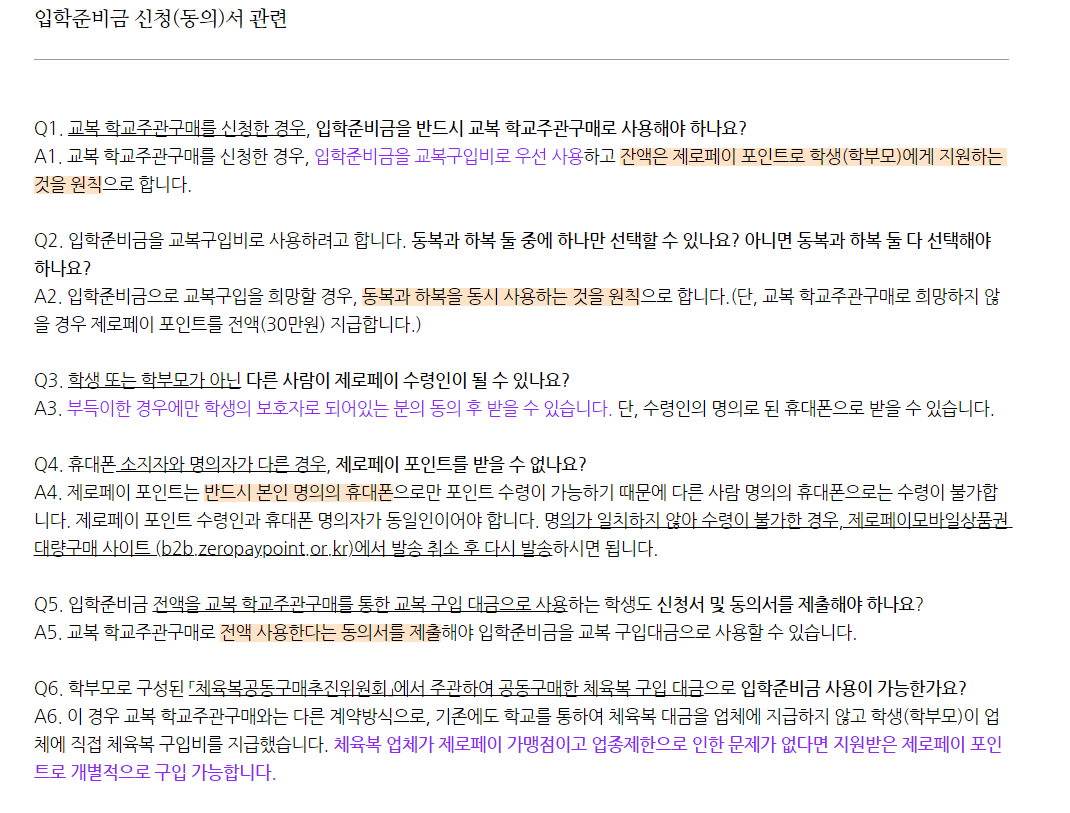 또한 신청 시 교복 학교주관 구매를 신청했을 때 구입비를 우선 사용하고 차액은 제로페이 포인트로 학생(학부모)에게 지원하고 있습니다.
