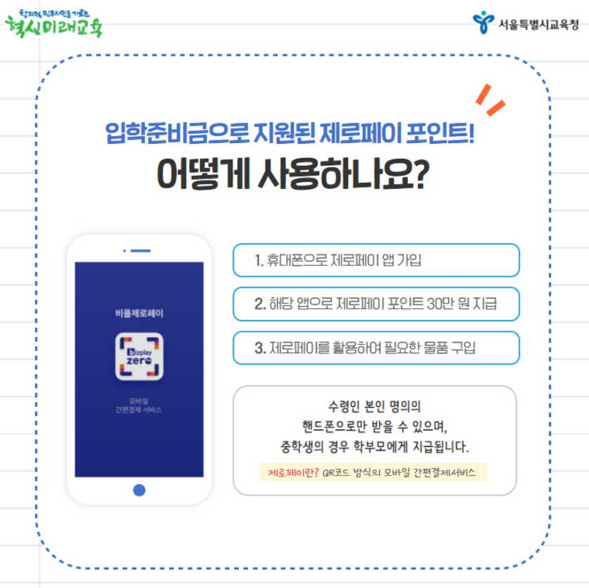 ⓒ서울시교육청 제로페이 포인트는 중학생의 경우 학부모에게 지급이 되고, 고등학생은 본인 명의 핸드폰으로만 가입하여 사용할 수 있습니다.