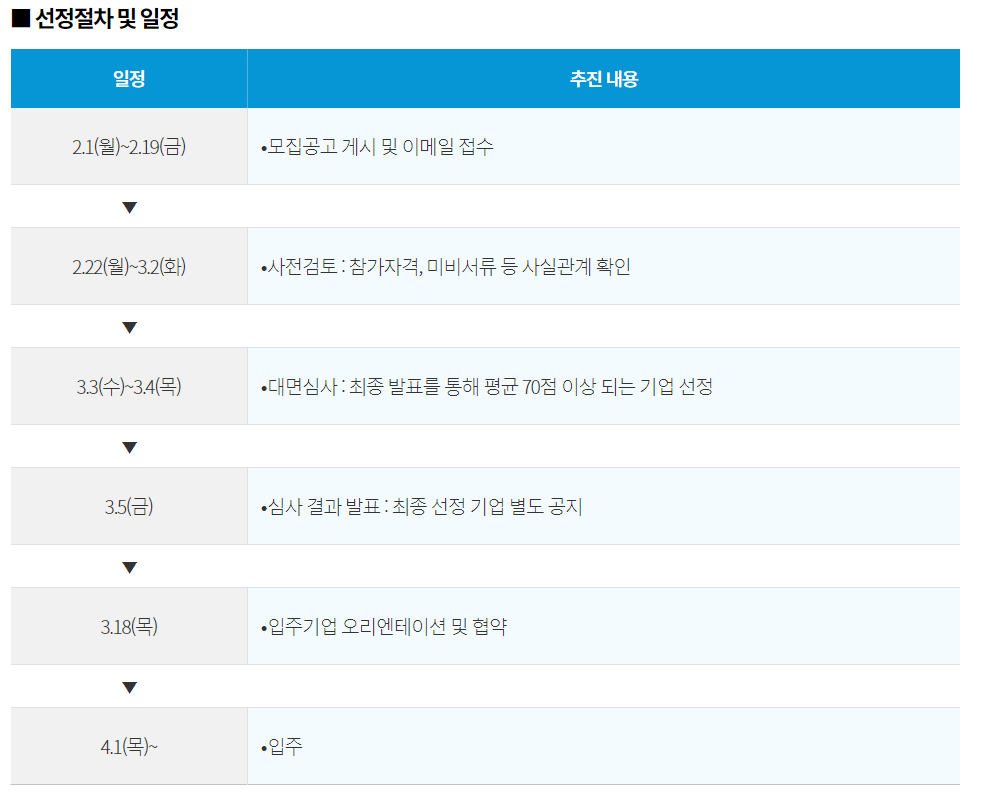 선정된 기업에 대해선 개별 사무공간을 최장 12개월간 무상으로 제공받으며 사무 공간 외 공용회의실, 세미나실, 휴게공간, 주차시설도 이용도 가능합니다.