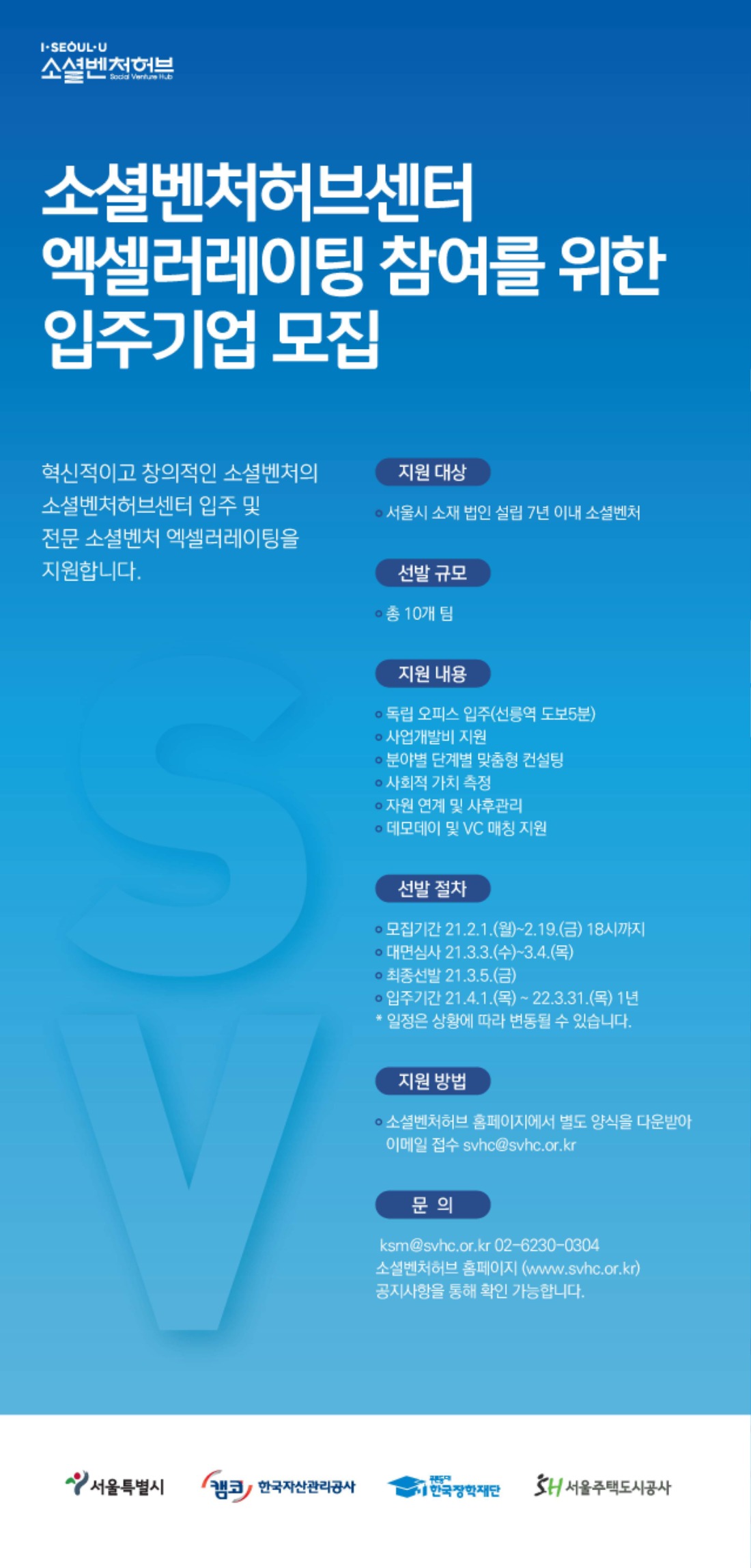 소셜벤처허브 입주기업 모집은 2월 19일 오후 6시까지이며 사회문제 해결에 기여하는 서울 소재 소셜벤처기업이 신청 대상입니다.