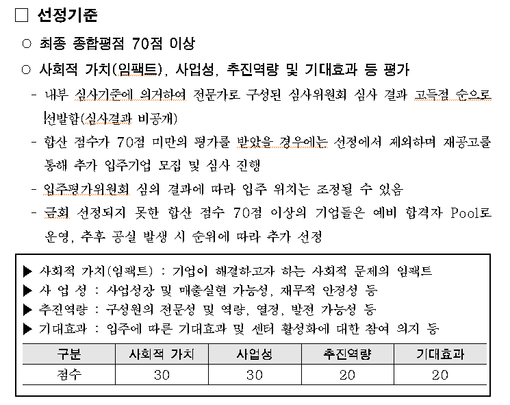 - 소셜벤처허브센터에서 제시하는 소셜벤처 판별 기준표(사회성 및 혁신 성장성)에 부합하는 소셜벤처로서, 서울시 내에 소재하거나, 입주 시 사업자등록 주소지를 센터로 이전하고자 하는 공고일 기준 창업 후 7년(84개월) 이내 법인 기업