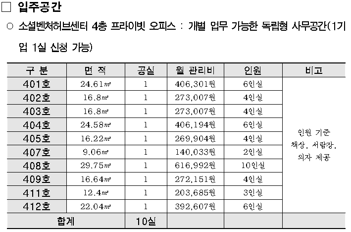 책상 및 의자, 서랍장 등 기본 사무기기가 구비되어 있고 관리비는 월 14만 원~61만 원 수준이라고 합니다.