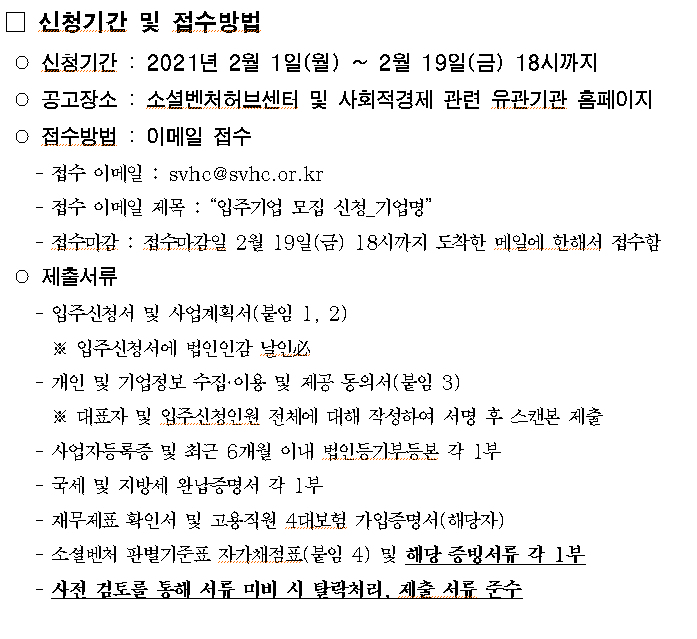 ○ 접수방법 : 소셜벤처허브 홈페이지에서 별도 양식을 다운로드하여 이메일(svhc@svhc.or.kr) 접수
