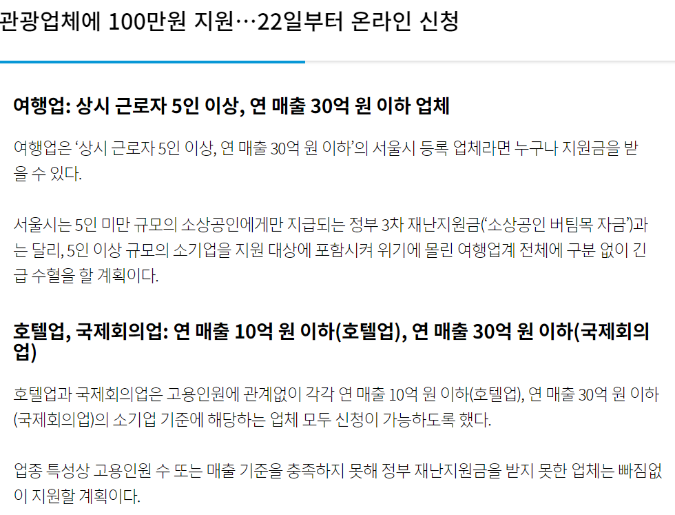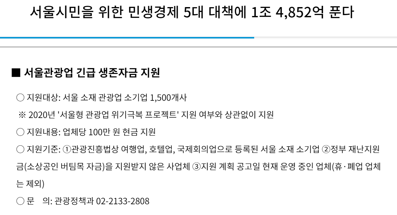 이번 서울시 긴급 생존자금은 시가 지난 2일에 발표한 민생경제 5대 온기대책의 일환으로 존폐위기에 놓인 관광업계에게 조금이나마 힘이 되는 것을 목표로 하고 있습니다.