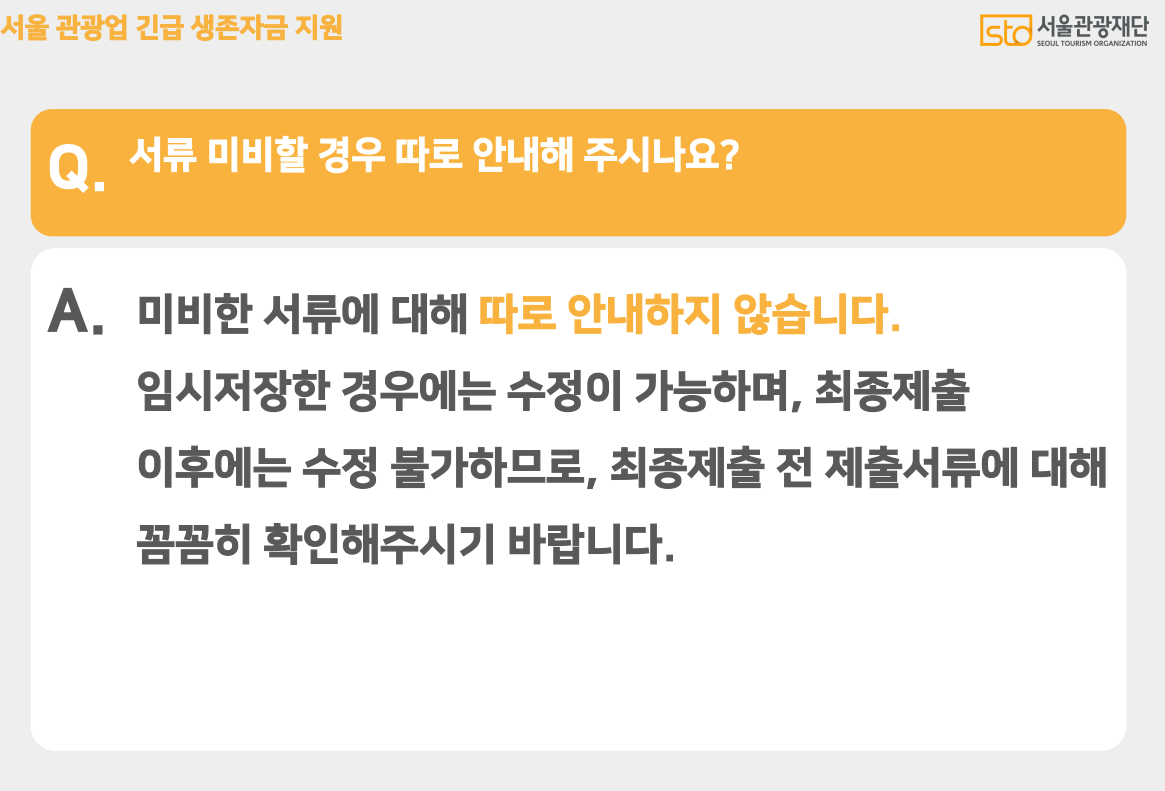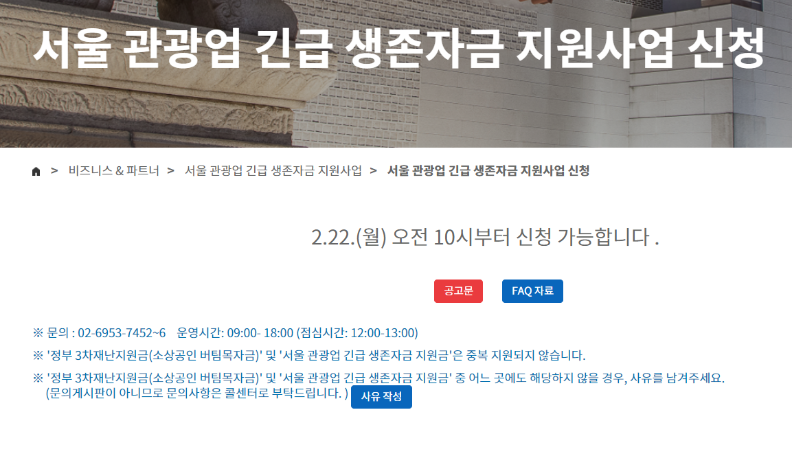 자세한 긴급 생존에 대한 공고문 및 FAQ는 위에서 살펴본 서울 관광재단 사이트에서 확인이 가능합니다.