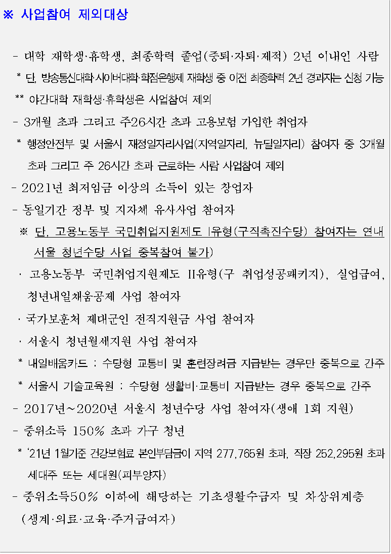 문의사항이 있는 경우 ‘서울시 청년수당 콜센터(1566-3344)’ 또는 ‘서울 청년포털 Q&A 게시판’을 꼭 참고하세요.