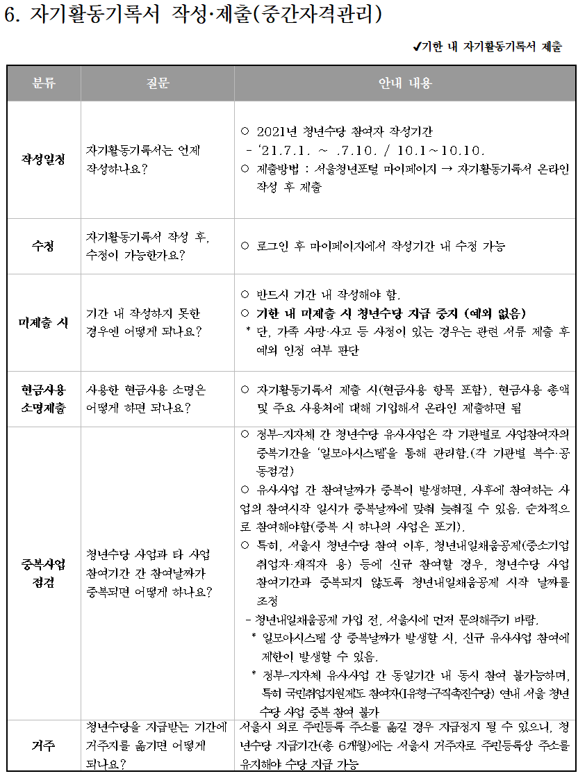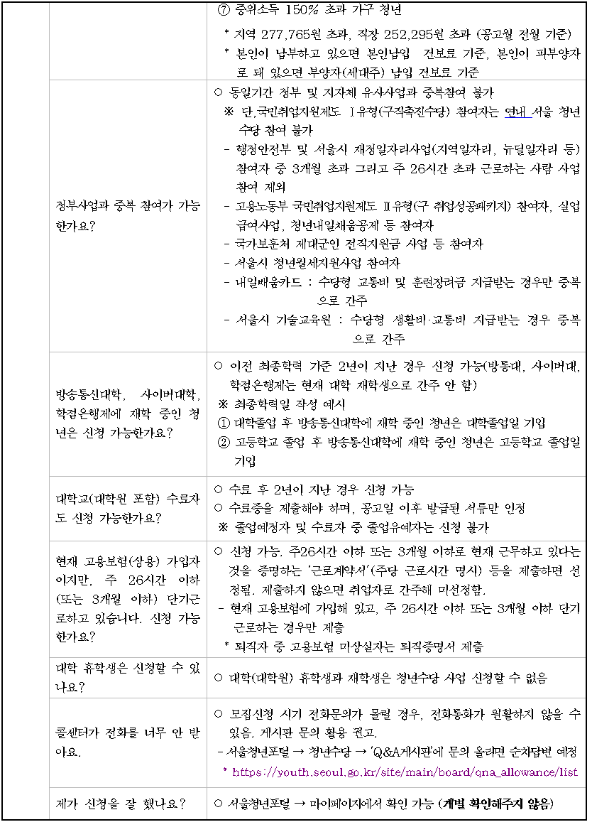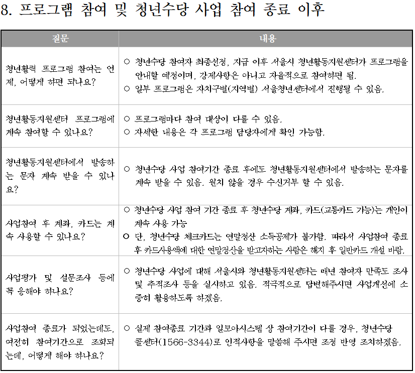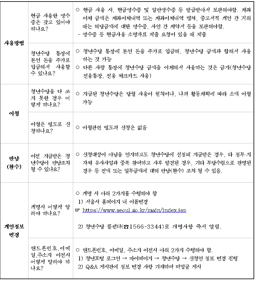 문의사항이 있는 경우 ‘서울시 청년수당 콜센터(1566-3344)’ 또는 ‘서울 청년포털 Q&A 게시판’을 꼭 참고하세요.