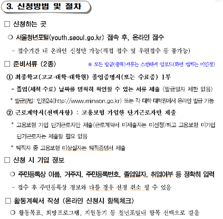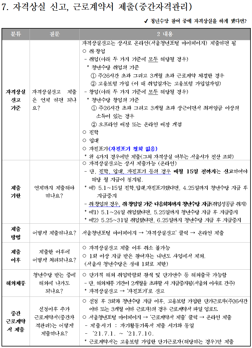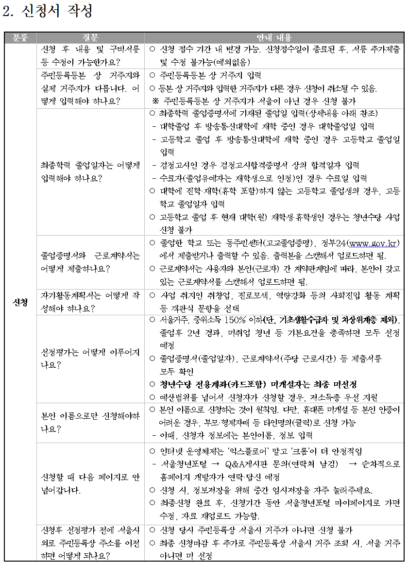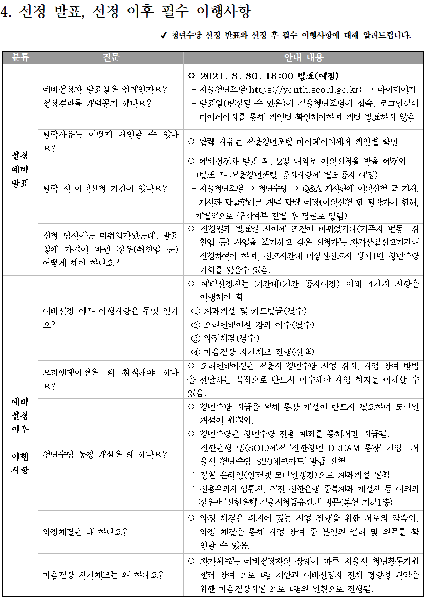 문의사항이 있는 경우 ‘서울시 청년수당 콜센터(1566-3344)’ 또는 ‘서울 청년포털 Q&A 게시판’을 꼭 참고하세요.