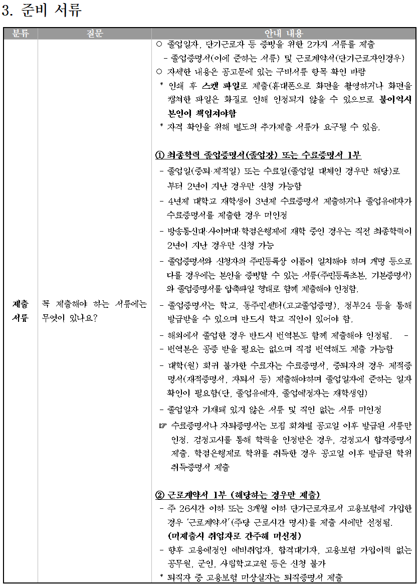 신청 시 준비해야 할 서류는 (1) 최종학교 졸업증명서 1부, (2) 근로계약서(고용보험에 가입했던)를 필요시 제출해야 합니다.