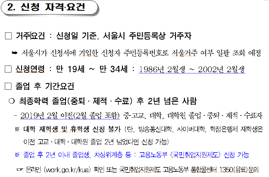 신청일 기준 주민등록 상 서울 거주 만 19~34세, 최종학력 졸업 후 2년이 지난 미취업 청년을 대상으로 모집하며 총 2만 명 내외 인원을 선정할 방침입니다.