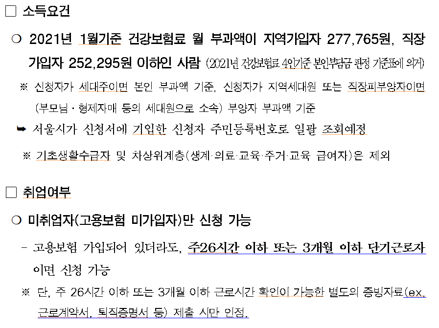 더불어 소득요건은 2021년 1월 건강보험료 월 부과액이 지역가입자 277,765원, 직장가입자 252,295원 이하면 신청 가능합니다.