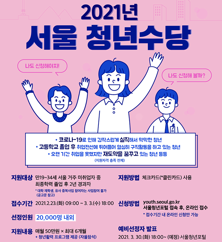 안녕하세요. 서울시가 2월 23일부터 3월 3일까지 2021년 청년수당 참여자를 모집합니다.