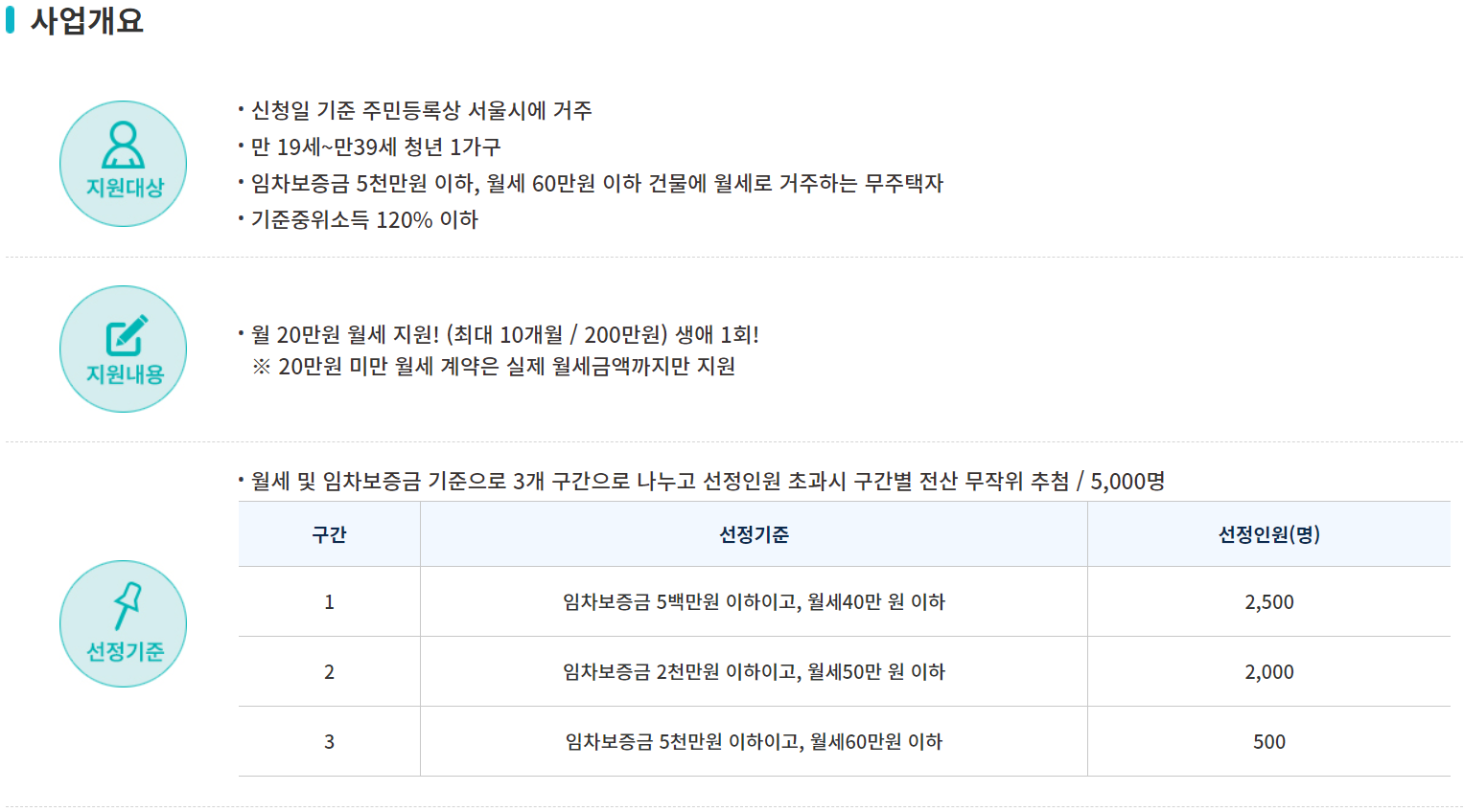 신청 자격 요건은 신청일 기준 서울시에 주민등록이 되어있고 실제 거주하는, 만 19세부터 39세 이하 청년 1인 가구를 대상으로 합니다.