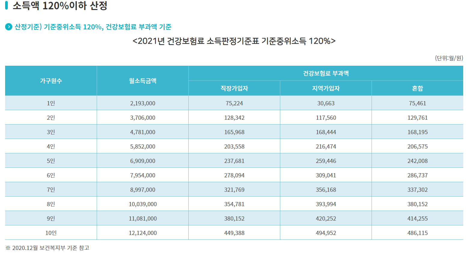 2021년 1인 가구 기준중위소득 120% 이하 건강보험료 부과액은 직장가입자의 경우 7만 5,224원이며, 지역가입자는 3만 663원입니다.