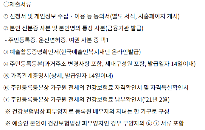 ※ 예술인 본인이 건강보험법상 피부양자인 경우 부양자의 ⑥ ⑦ 서류 포함