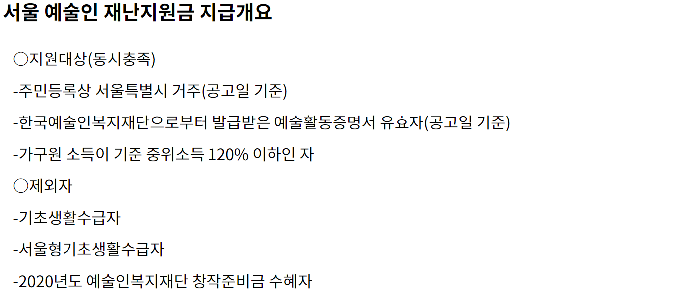 ⓒ서울시 ▷서울시 예술인 긴급재난지원금 신청자격