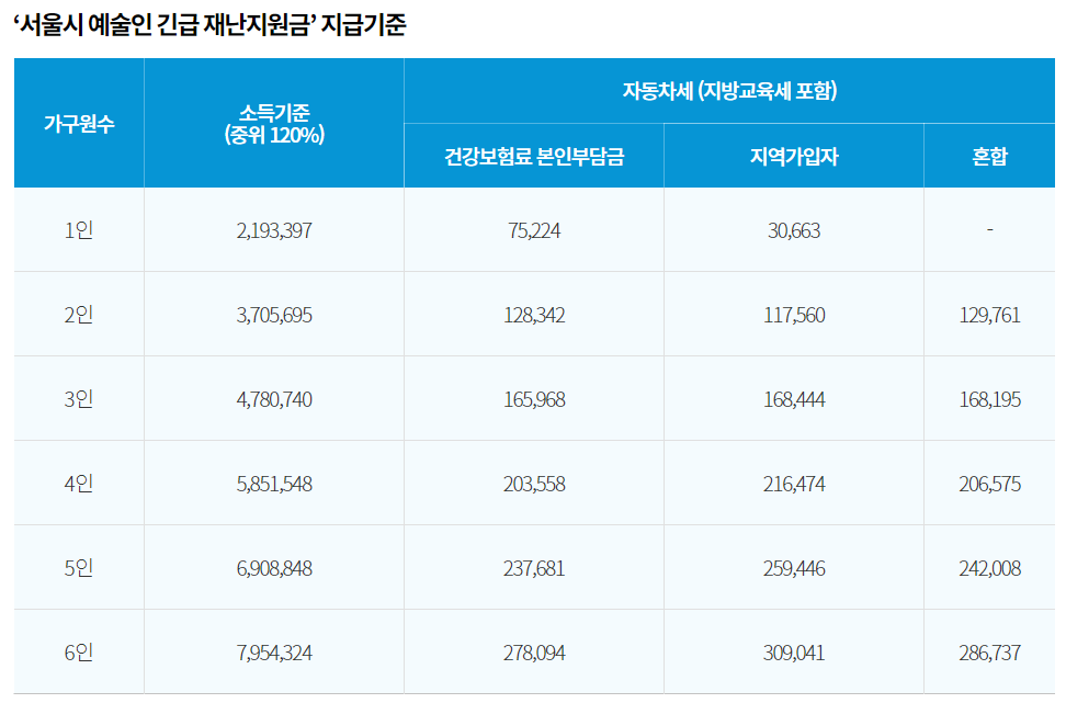 ‘서울시 예술인 긴급 재난지원금’ 지급 대상은 주소. 소득, 예술인 확인 가능한 서류 3가지를 모두 충족해야 합니다.