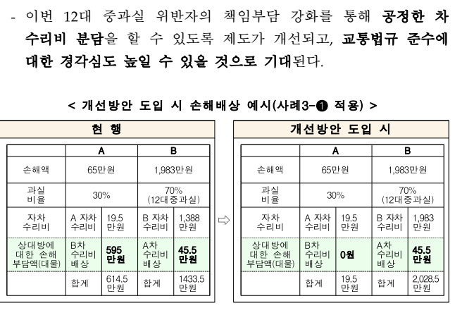 위 내용을 포함하여 국토교통부에서는 자동차보험 제도를 개선하며 사고 부담금 강화를 통한 ‘가해자 구상권’의 도입과 12대 중과실 사고 시 가해자의 수리비 청구 제한이 가능하도록 하였습니다.