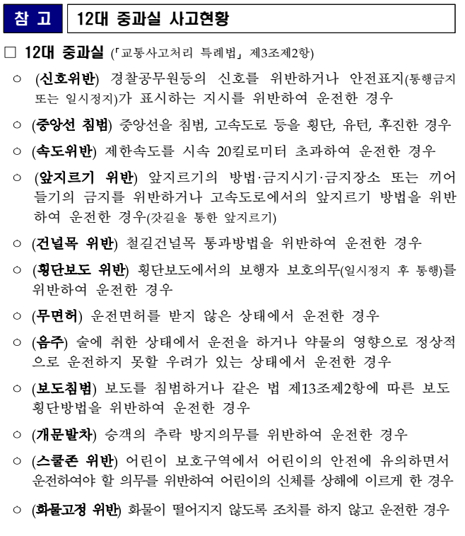 ⓒ국토교통부 자동차사고 12대 중과실에는 교통사고처리 특례법상 △신호위반 △중앙선 침범 △속도위반 △앞지르기 위반 △건널목 위반 △횡단보도 위반 △무면허 △음주 △보도 침범 △개문발차 △스쿨존 위반 △화물 고정 위반 등이 있습니다.