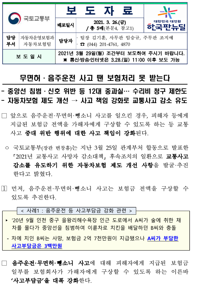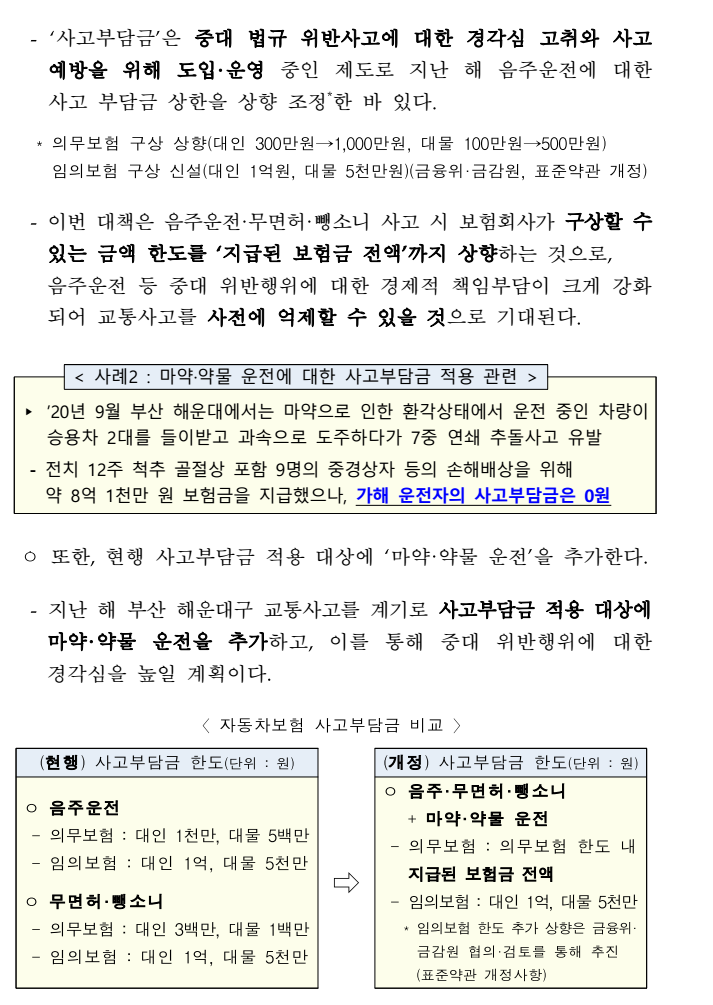 사고부담금 적용 대상도 ‘음주, 무면허, 뺑소니’에서 ‘약물 운전’등 및 12대 중과실을 포함하여 이르면 이번 하반기부터 시행될 예정입니다.
