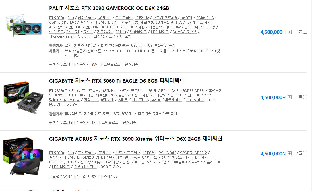 RTX3070, 3080은 이더리움 등의 암호화폐 채굴용으로 자주 언급되는 제품으로 최저 60만 원대에서 요즘은 190만 원까지 치솟았습니다.