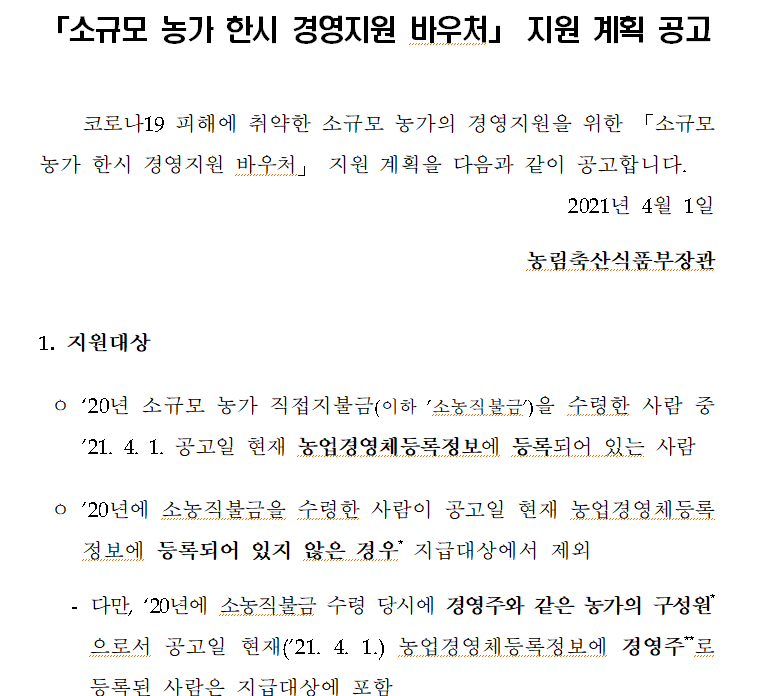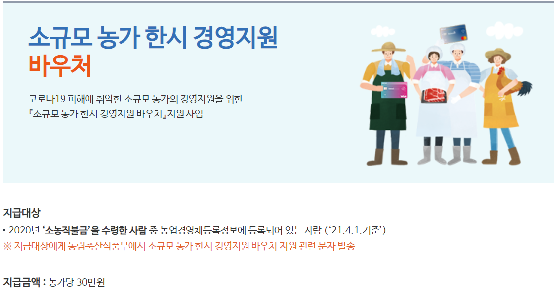 정부가 4월 5일부터 코로나 19 피해에 취약한 소규모 농가의 경영지원을 위해 농가당 30만 원 상당의 바우처를 지급하고 있습니다.