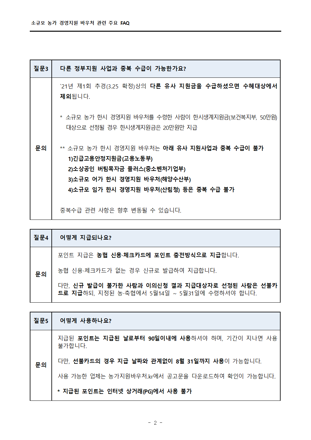 단, 농가 지원 바우처를 받은 경우에는 ‘긴급 고용안정 지원금(고용노동부)과 ‘소상공인 버팀목 자금 플러스(중기부)’등을 중복으로 수급받을 수 없습니니다.