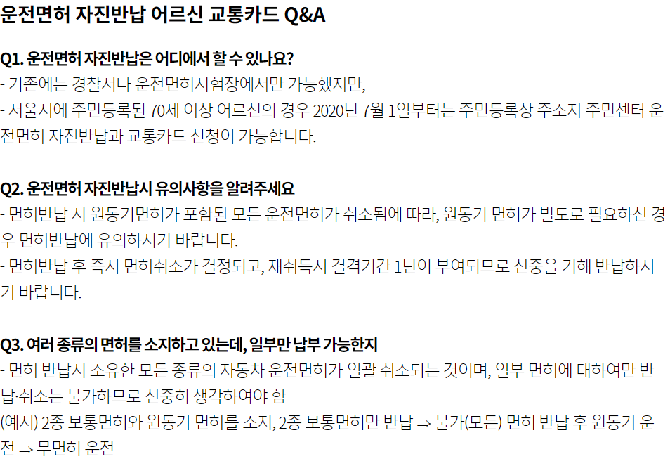 신청 대상은 면허 반납일 기준 서울시에 주민등록이 되어있는 만 70세 이상(1951.12.31. 이전 출생) 어르신으로 운전면허 자진반납 혜택을 받은 적이 없어야 합니다.