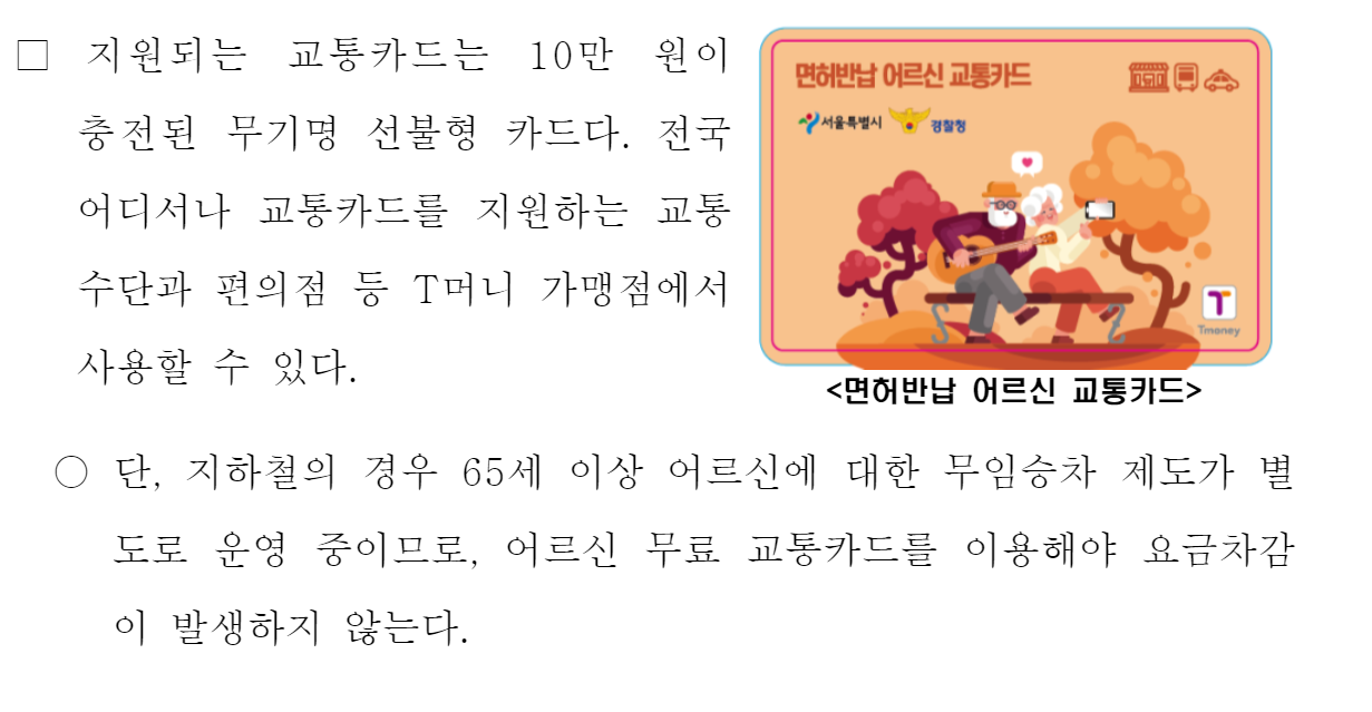 ⓒ서울시 다만 현재 지하철의 경우 65세 이상 어르신에 대한 무임승차 제도가 별도로 운영 중이므로, 어르신 무료 교통카드를 이용해야 요금차감이 발생하지 않는다.