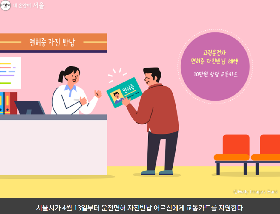 서울시가 ‘운전면허 자진반납 어르신 선불 교통카드 지원사업’을 4월 13일부터 시행합니다.