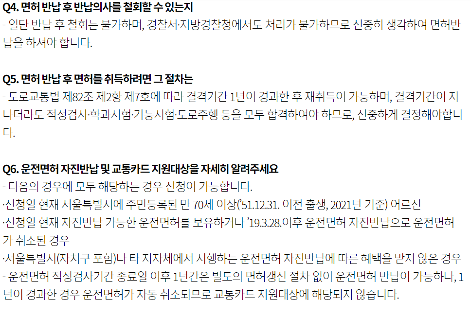 신청 대상은 면허 반납일 기준 서울시에 주민등록이 되어있는 만 70세 이상(1951.12.31. 이전 출생) 어르신으로 운전면허 자진반납 혜택을 받은 적이 없어야 합니다.