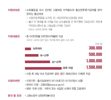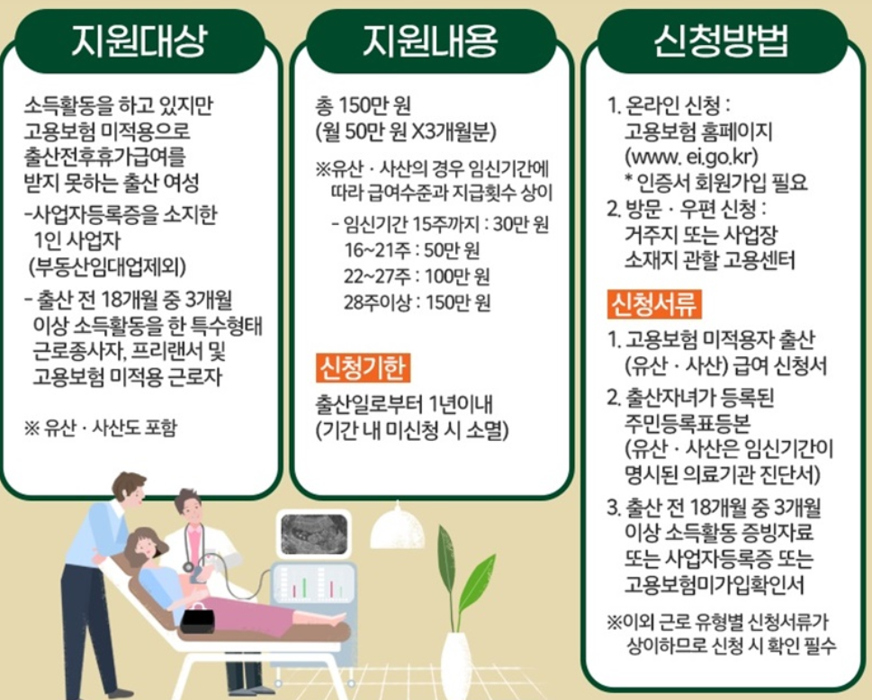 이에 고용보험 적용을 받지 못한 임산부를 위해 총 150만 원의 출산급여를 지원합니다.