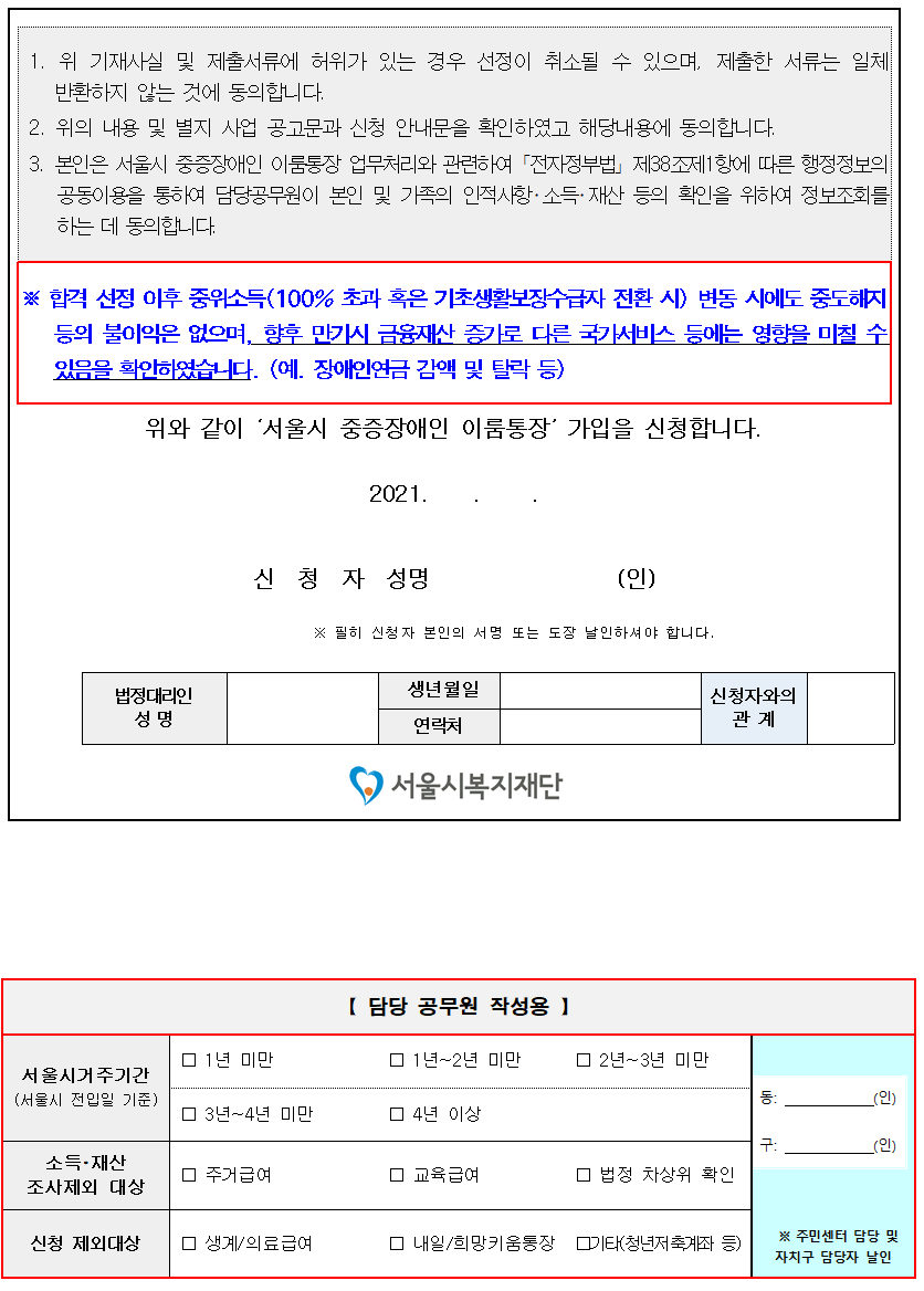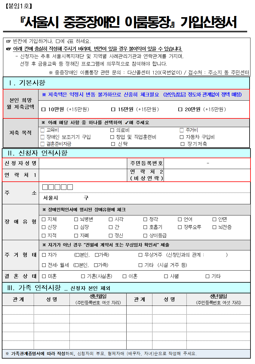 ⓒ서울시 서울시 중증장애인 이룸통장 신청서류.hwp0.17MB신청자에 대한 면접 없이 제출 서류만으로 심사‧선정하며, 8월 말 최종 선발자를 발표할 예정입니다.