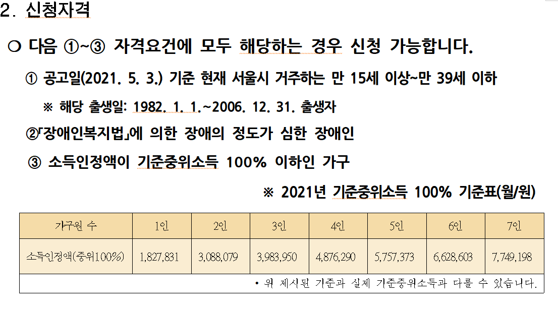 신청자격은 공고일 기준(5월3일)으로 소득인정액 및 나이요건을 충족해야 합니다.