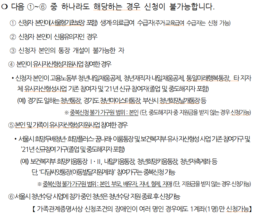 ⓒ서울시 단, 신청자 본인이 생계·의료급여 수급자 거나 신용유 의자인 경우는 신청 대상에서 제외됩니다. 아울러 가구원 중 1명만 신청 가능하며 기존 ‘희망 두배 청년·희망플러스·꿈나래통장’ 참여 등도 신청 대상에서 제외됩니다.