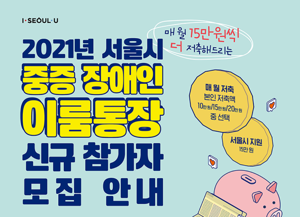 서울시가 청년 중증장애인의 경제적 어려움과 미래 불안감 해소를 위해 오는 5월 3일부터 이룸통장 혜택 참여자 1,000명을 신규로 모집한다.