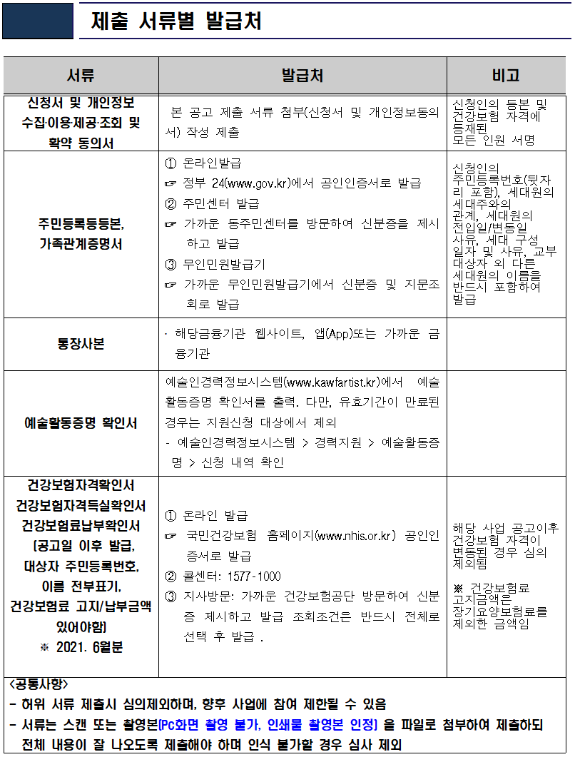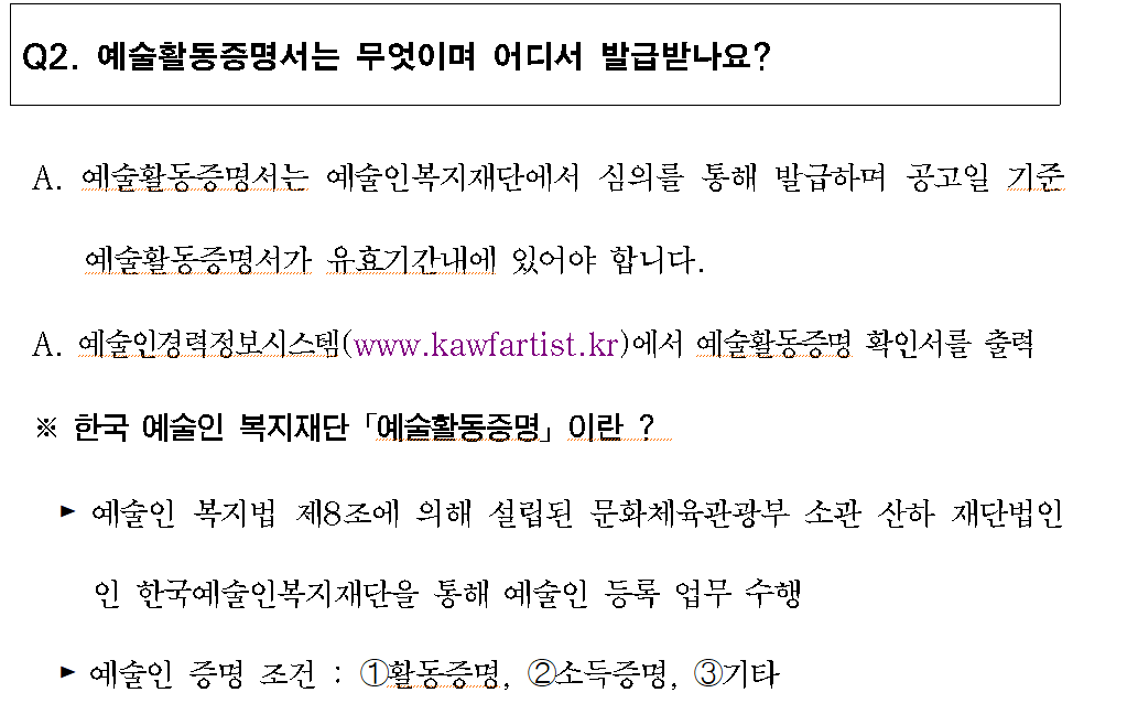 ② 한국예술인 복지재단으로부터 발급받은 예술활동 증명 확인서 유효기간이 공고일 현재 유효해야 합니다.