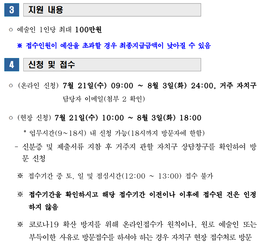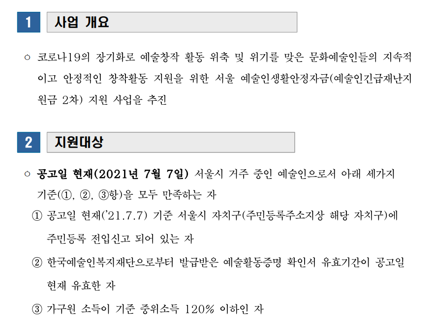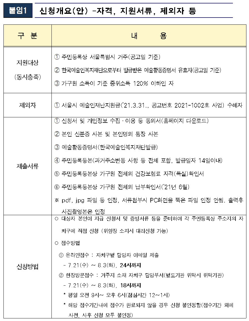 공고일 현재(2021년 7월 7일) 서울시 거주 중인 예술인으로서 아래 3가지 기준을 모두 만족해야 합니다.