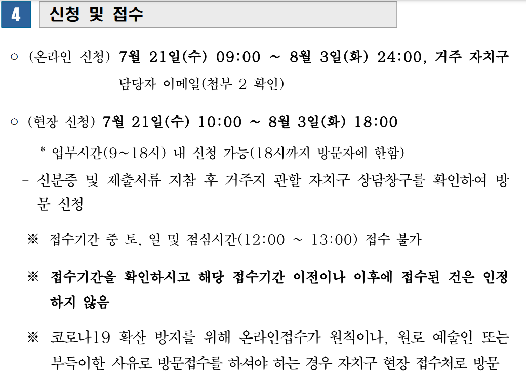 1) 온라인 신청) 7월 21일(수) 09:00 ~ 8월 3일(화) 24:00까지 거주 자치구 담당자 이메일로 접수해야 합니다.