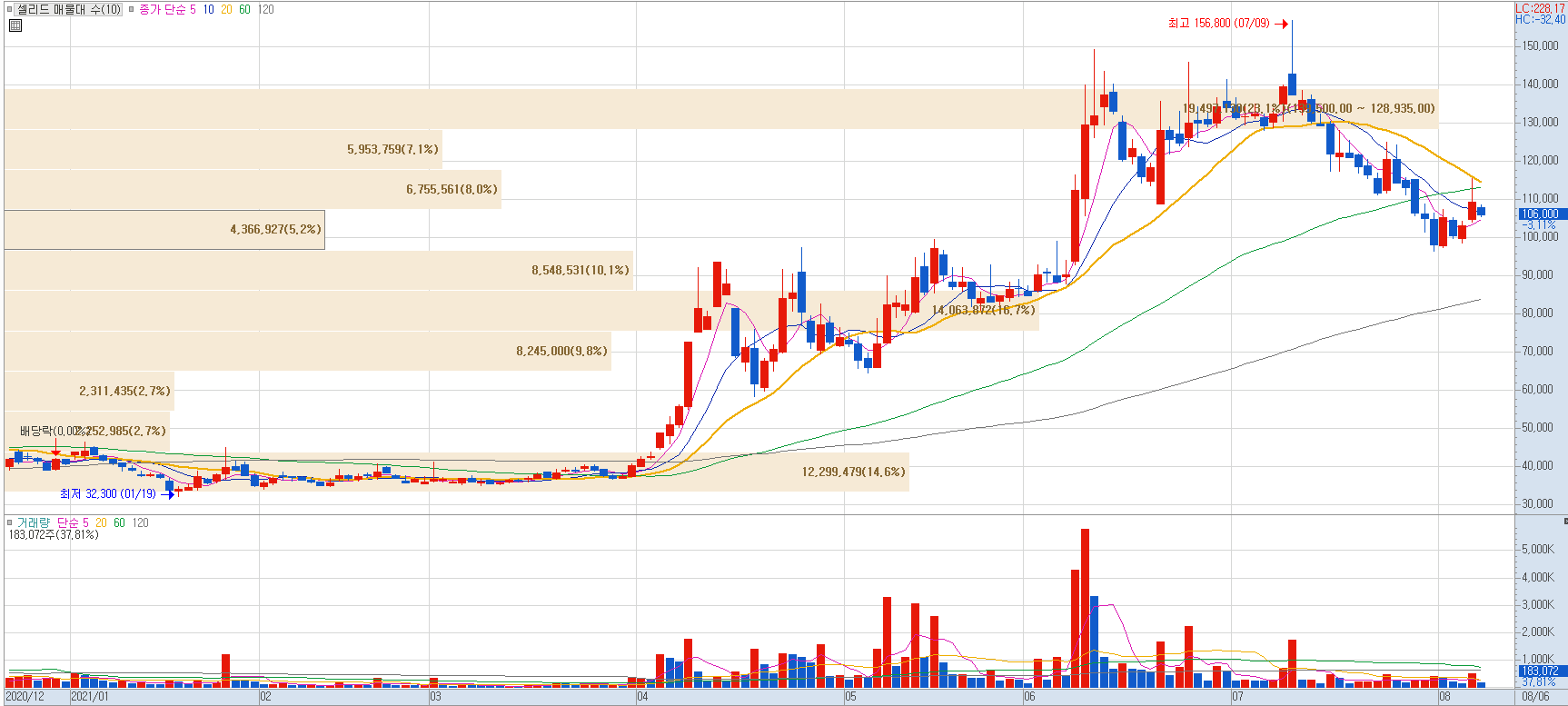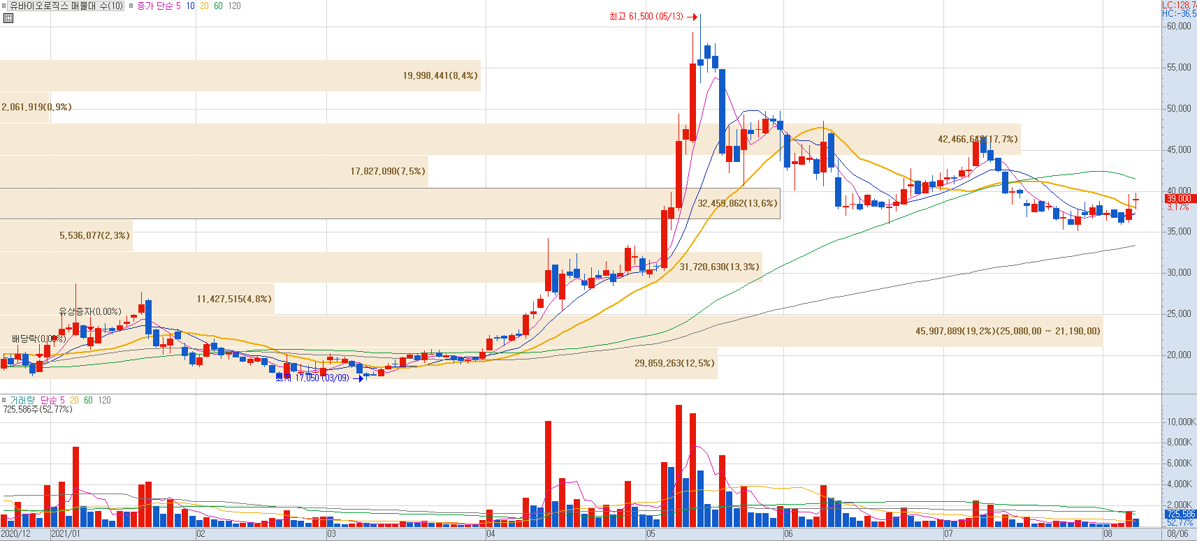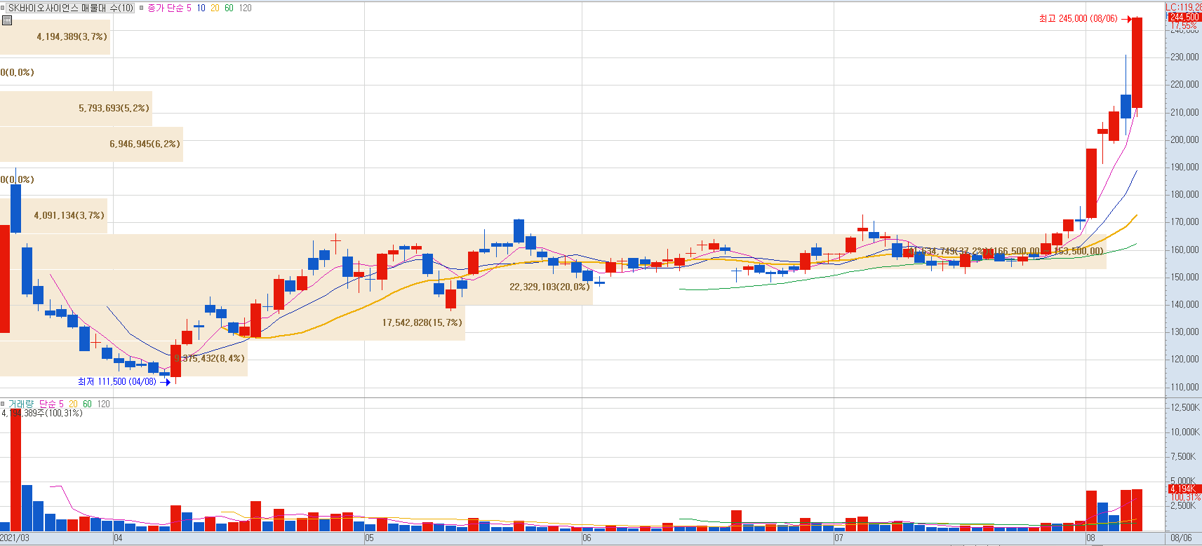 GBP510, NBP2001 동시 개발 중으로 둘 중 하나의 백신을 3분기 내에 3상 진입이 목표입니다. 올해 2분기 영업이익이 662억원으로 전년 동기 대비 흑자전환한 것으로 잠정 집계되며 여기에 이어 하반기에도 CMO/CDMO-노바백스 정부 계약 물량 등으로 더욱 성장하여 호실적을 이어갈 것으로 전망되며 최근 주가가 연일 강세를 보이고 있습니다.