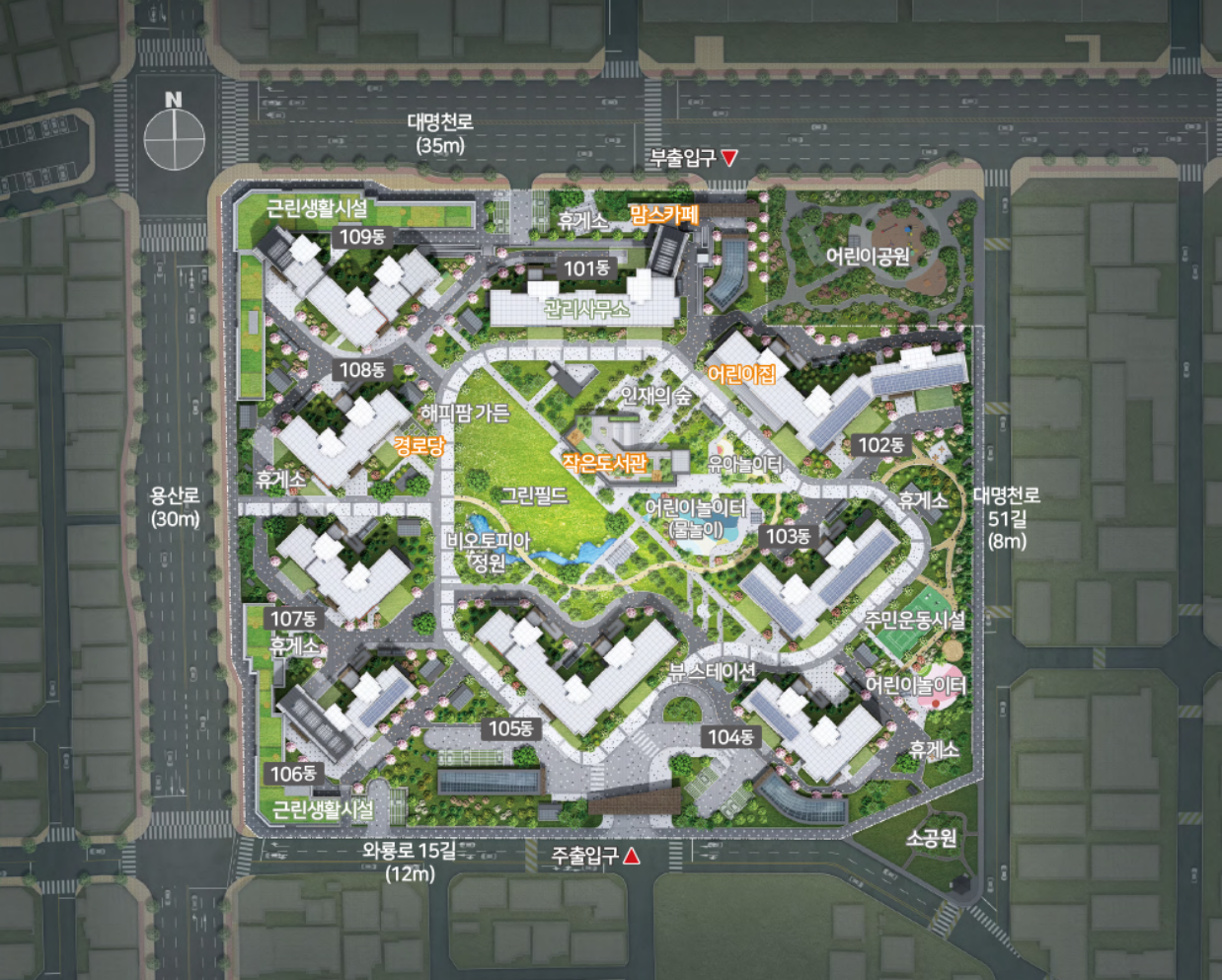 역세권 입지는 아니지만 남대구IC. 와룡로가 인접하고 용산역, 죽전역을 비슷한 시간대로 이용할 수 있습니다. 이를 보완하듯 커뮤니티 시설에 굉장히 신경을 많이 썼습니다. 단지내 피트니스, 맘스카페, 어린이집은 물론 실내 골프연습장, 스카이 라운지, GX 룸등을 갖춥니다.