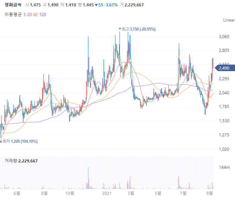 영화금속은 올 상반기 1152억원의 매출을 기록했으며 동사가 위치한 진해 산업단지가 가덕도와 가까워 가장 큰 부각을 받고 있습니다.