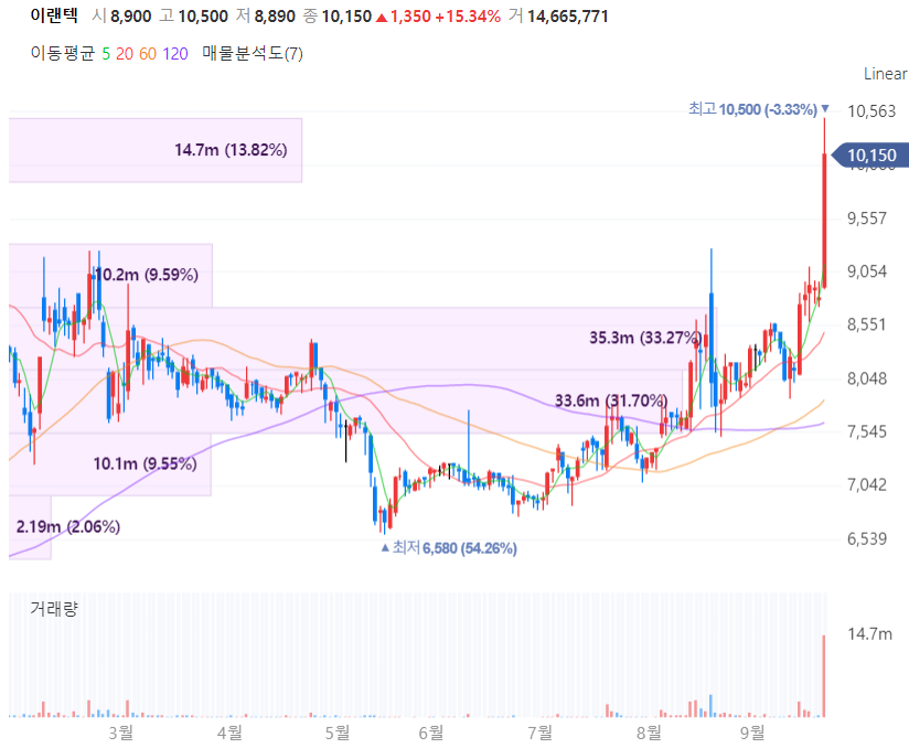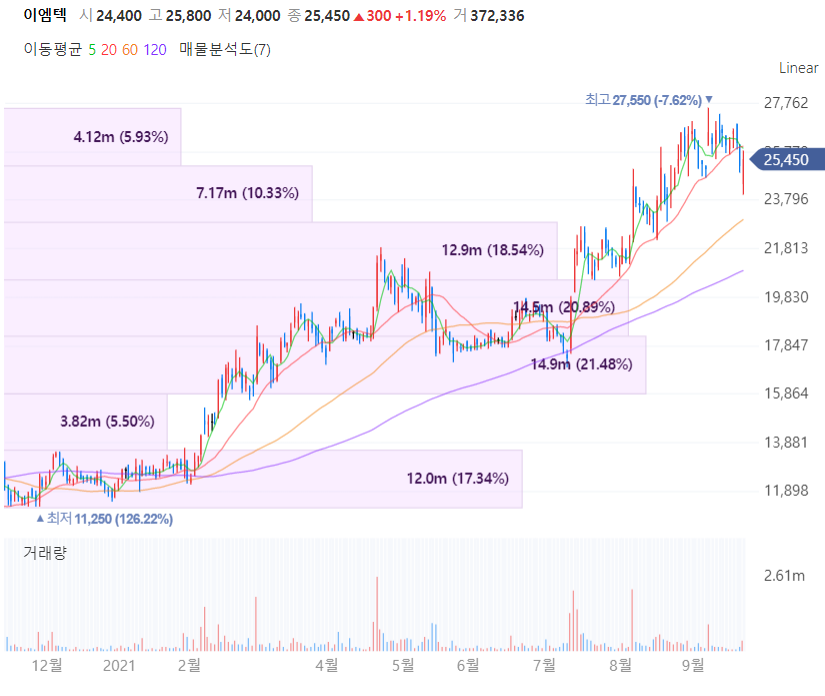 이엠텍의 실적을 살펴보면 상반기 연결기준 매출액이 1800억원으로 전년대비 109% 늘어났고, 영업이익은 140억원으로 흑자전환했습니다.