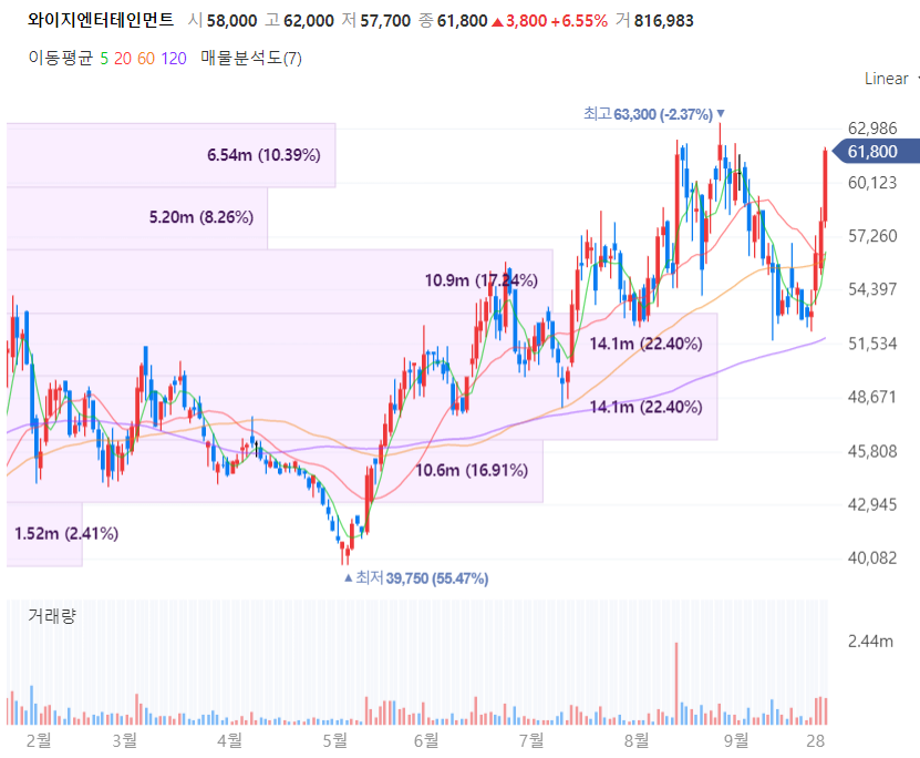 와이지엔터테인먼트는 코로나로 인한 비대면 콘서트, 온라인 시장에서 확대와 더불어 리오프닝 관련주로 부각되며 오프라인 시장 및 팬덤 강화로 3분기 실적이 컨센서스를 상회할 것으로 전망됩니다.