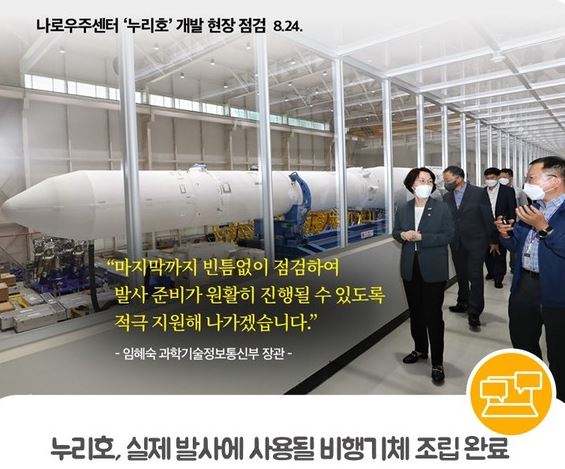 과학기술정보통신부는 지난 29일 누리호 발사관리위원회를 열어 리호 1차 발사를 위한 기술적 준비상황과 최적의 발사 여건 등을 종합 검토한 결과 누리호 발사 예정일을 10월 21일로 정했습니다.