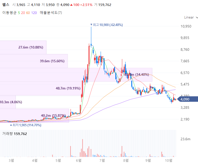 웹스는 고분자 소재의 개발, 생산 및 판매를 목적으로 설립되어 자동차용 인테리어 및 봉지 내장재 시장에서 과점적인 지위를 확보하고 있습니다. 매출구성은 컴파운드 73.55%, 건축외장재 22.89%, 임대료 외 3.55%로 이루어지는데 윤석열 전 총장이 골목상권 활성화를 위한 도시재생사업 필요성을 언급한 뒤 웹스의 사업분야가 주목받으며 크게 상승했습니다.