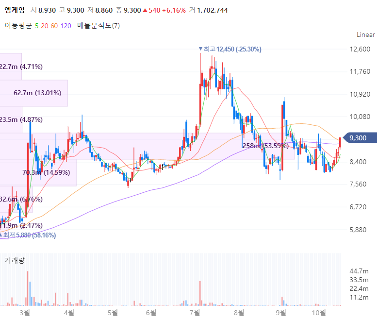 엠게임은 나이트온라인, 열형강호, 이너널시티, 드로이얀 등 다수의 인기 게임 개발 및 공급을 전문으로 하는 기업입니다. 최근 엠게임은 진열혈강호 MMORPG로 동남아시아지역 열풍을 몰고 있으며 태국서비스를 지난달부터 돌입하여 베트남지역도 내년초에 진행할 방침이며 NFT 기술을 기반으로 하는 블록체인 게임 생태계 구축 중에 있습니다. 매출은 국내 35%, 해외 65%로 구성되며 게임 로열티 사업외에도 스마트팜, 암호화폐를 신사업으로 추진중입니다.