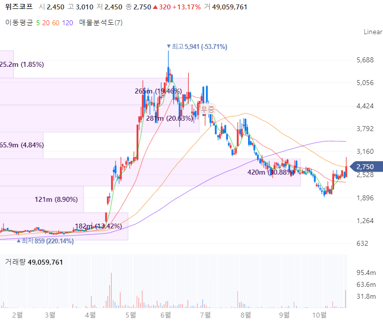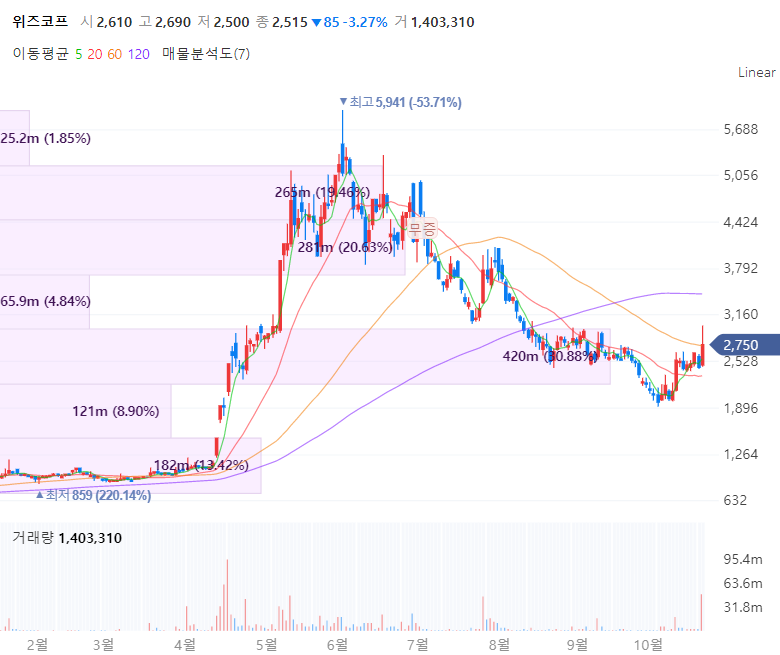 위즈코프는 1995년 3월 설립되어 정보시스템 소프트웨어 개발 및 관리용역, 통합서비스업을 주 영업목적로 합니다. 2008년 2월 한국도로공사로부터 정읍(순천) 고속도로 휴게소 및 주유소의 운영권을 낙찰 받아 휴게소 및 주유소의 관리운영을 영위하며 한국도로공사의 운영평가에서 1등급 2개소와 3등급 1개소를 보유하고 있는 것으로 알려져 있습니다. 아울러 위즈코프는 벤처 육성 비즈센터를 운영하고 정승환 대표가 윤석열 전 총장과 서울대 동문이라는 점 또한 부각받고 있습니다.