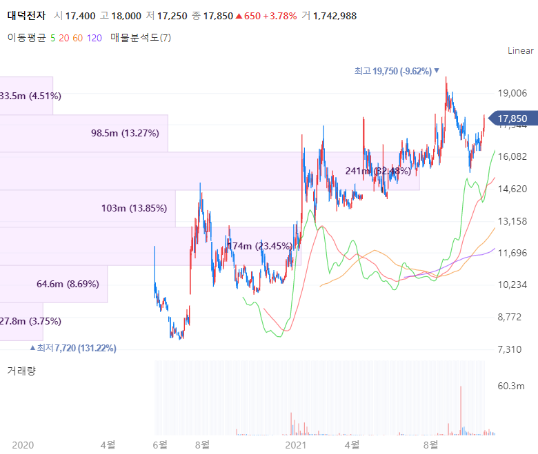대덕전자는 2005년 인적분할로 설립된 신설회사로 재상장했으며 대덕의 사업 중 PCB(인쇄회로기판)을 담당합니다. 반도체 및 Mobile 통신기기 등 각 분야에 걸쳐서 첨단 PCB를 공급하고 있으며 대덕전자는 그중에서도 PC의 중앙처리장치(CPU)용 반도체 기판(FC BGA)을 주력으로 생산합니다. 특히나 재택근무 등이 늘어나면서 PC의 신규 및 교체 수요가 급증에 따라 수혜를 보았으며 새로 투자한 반도체 기판은 PC에 이어 서버, 게임콘솔, 자율주행 등 다양한 분야로 쓰임새로 확대되었습니다. 아울러 대덕전자의 올해 매출 9700억원, 영업이익 590억원을 기록할 전망이 나옵니다.